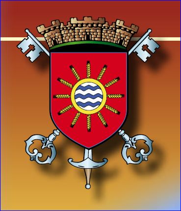 De gueules à la fontaine héraldique fascée ondée d'argent et d'azur, cerclée d'or et rayonnante de douze épis de blé du même.
