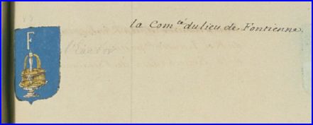D'azur à la fontaine d'or, jaillissante d'argent, surmontée de la lettre capitale F du même.