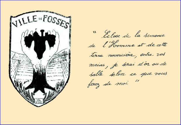 (1985) D'azur à la champagne de sinople surmontée d'une divise ondée d'argent; à l'arbre chimérique arraché du même constitué par deux mains, dextre et senestre, soutenant et supportant une ville d'or, brochant sur le tout.