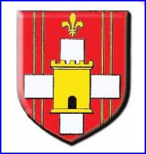 De gueules à deux jumelles d'or (de sable) en pal et aux flancs de l'écu, à la croix alésée d'argent abaissée et brochante, sommée d'une fleur de lis d'or; à la tour du même maçonnée et ouverte de sable brochant en coeur sur la croix.